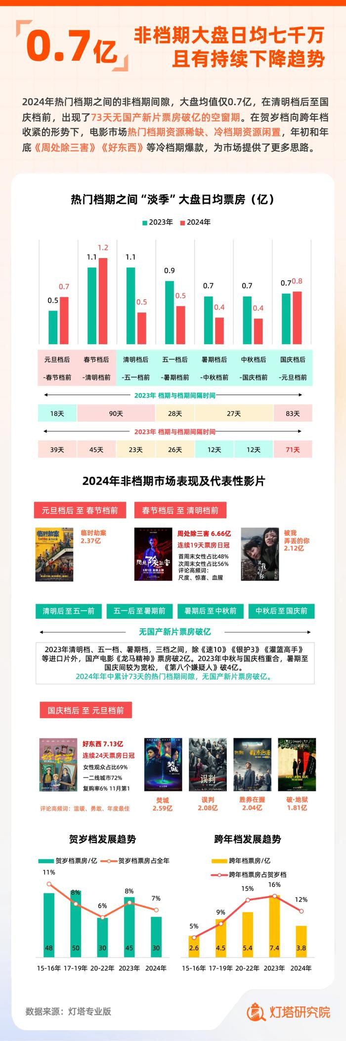 而在2024年热点档期之间的非档技术隙,大盘均值仅0.7亿元。在晴明档后至国庆档前,致使出现了73天无国产新片票房过亿元的空窗期。同期在贺岁档要点向跨年档收紧的趋势下,电影商场热点档期资源稀缺、冷档期资源闲置。