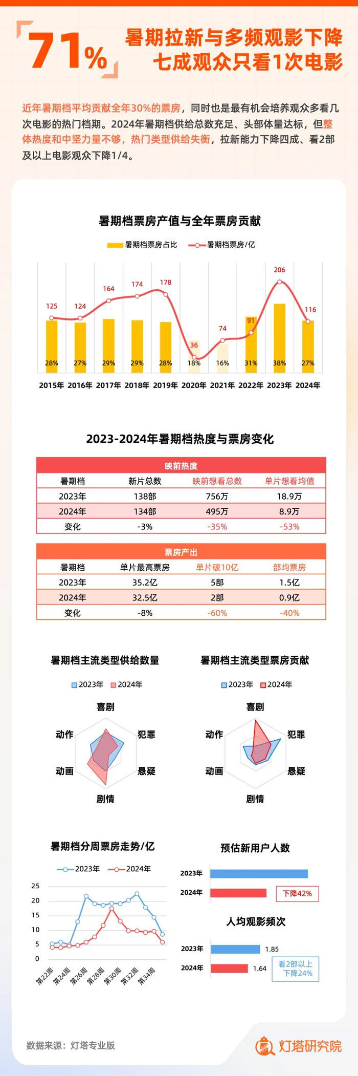 关于这一阐发,行业里面有着不同的声息。有的以为,之是以会出现票房与不雅影东谈主数的大幅双降,是因为2024年的电影商场困难优质推行影片;有的则以为,之是以商场不景气,一方面是受宏不雅经济环境的影响,另一方面则是不雅众破钞民风发生了变化,而影片供给不管是从周期照旧推行类型上,皆未能实时抖擞商场需求。