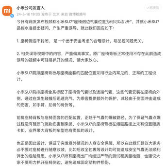 【合理绸缪!小米回话SU7品控水准疑问】日前,有网友发布视频称小米SU7“座椅侧边气囊位置为何不错扒开”,并就小米SU7品控水准冷漠疑问,产生严重误导。就此小米公司发言东说念主作念出官方回话,具体如下: