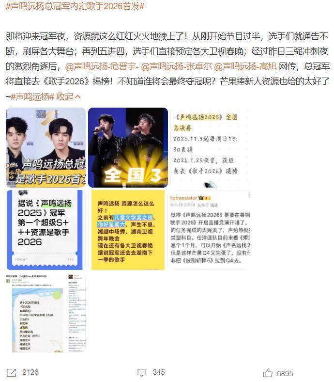 在四晋三的比赛中,危晋宇、张卓尔、高旭得手晋级,也即是说,鄙人期节目中,他们三东谈主将争夺冠军,芒果的资源是曲常好的,是以四晋三比赛适度后,网上传出音书,《声鸣远扬2025》总冠军将纵贯《歌手2026》。