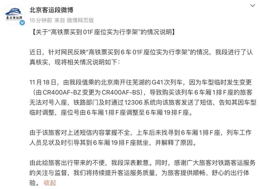 11月19日,@北京客运段 发布对于“高铁票买到01F座位实为行李架”的情况诠释: