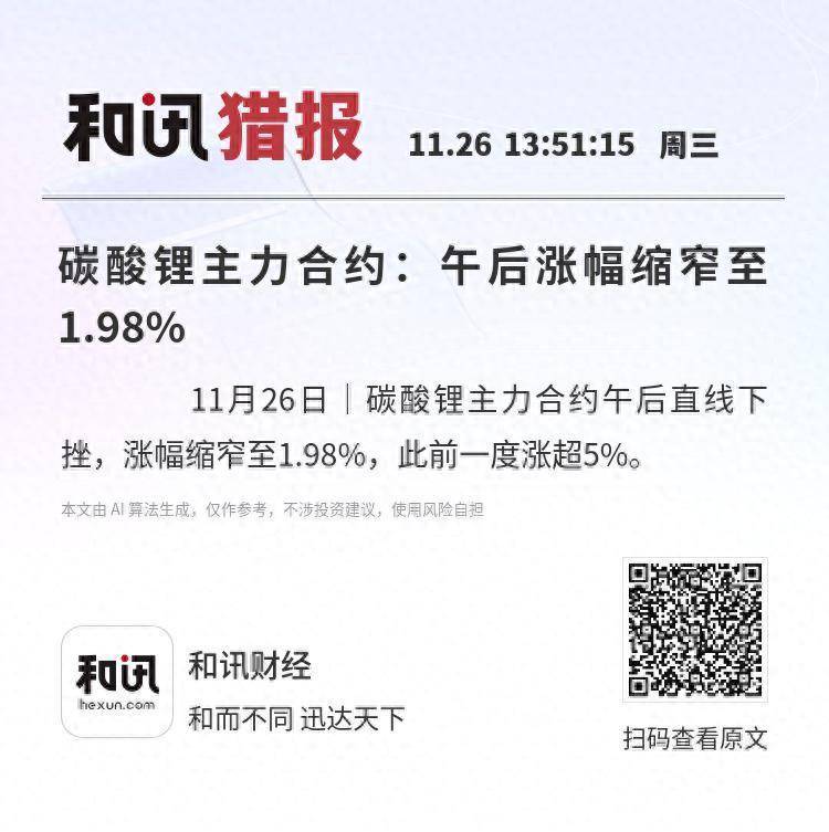 11月26日|碳酸锂主力合约午后直线下挫,涨幅缩窄至1.98%,此前一度涨超5%。